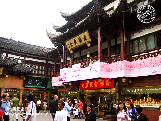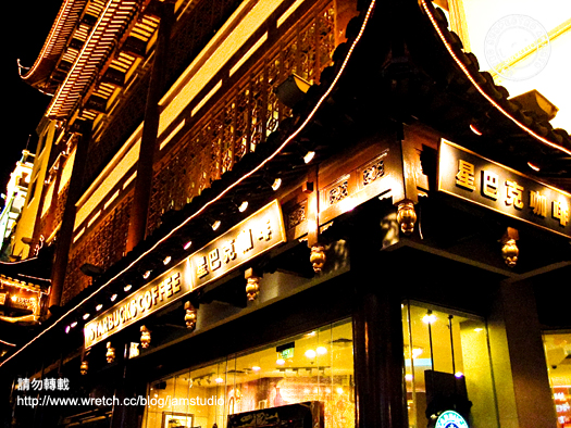 寫著中文的星巴克招牌和中式建築有強烈對比。