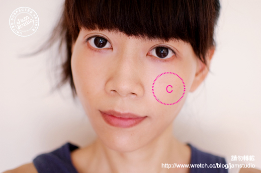 b.力道不對的人很容易在上完密粉後刷上腮紅霜時,產生一塊一塊推不勻的現象。