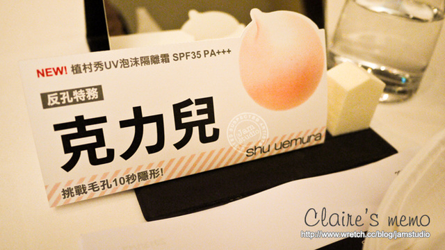 接著在其中一塊油膩膩的皮脂上拍上植村秀的泡沫隔離霜,