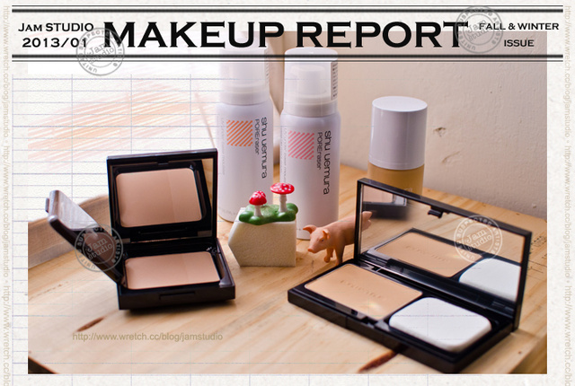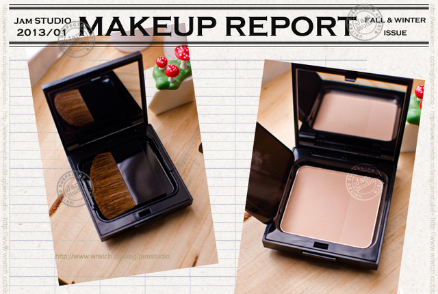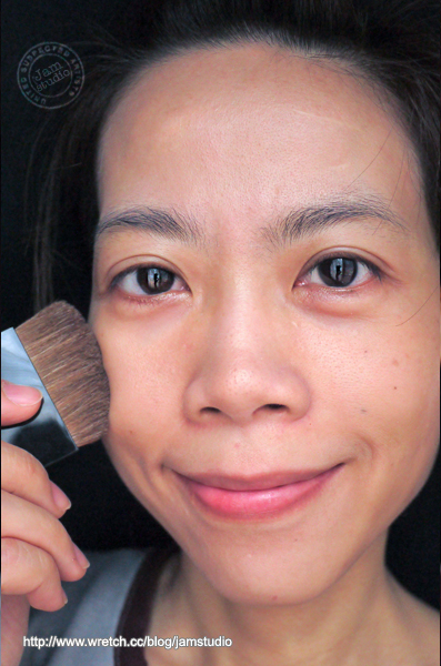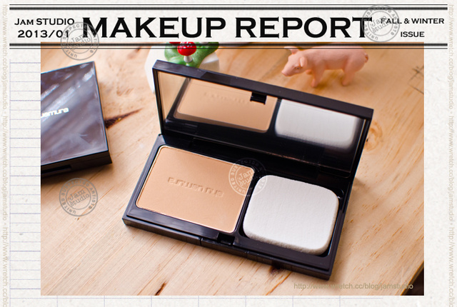 左邊準備在剛剛已經上過隔離霜的臉刷上一層植村秀的「雙效持妝蜜粉餅」,