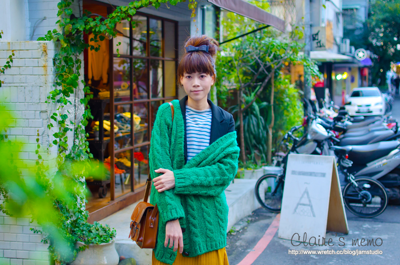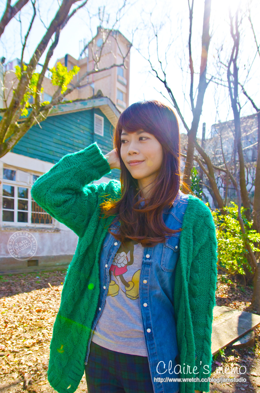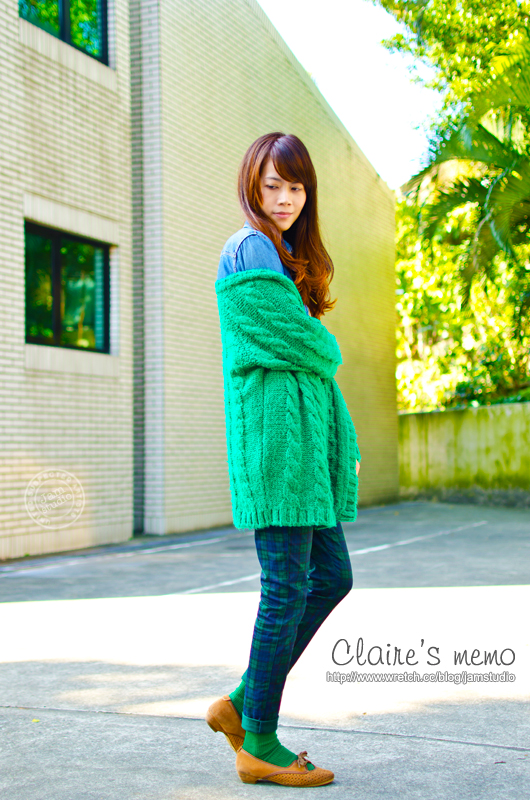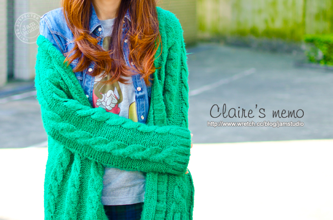 因為針織毛衣洞洞很大所以裡面加了可以擋風的綠色連帽薄外套,
