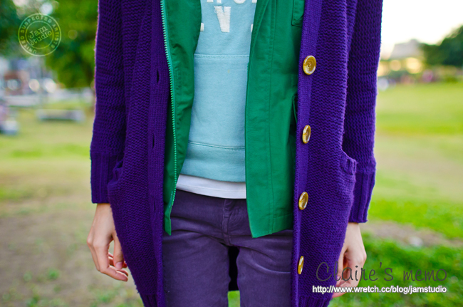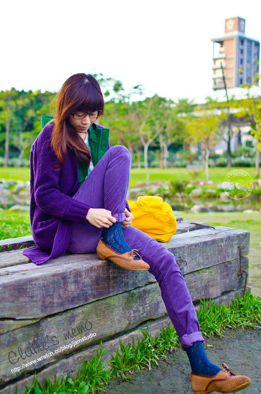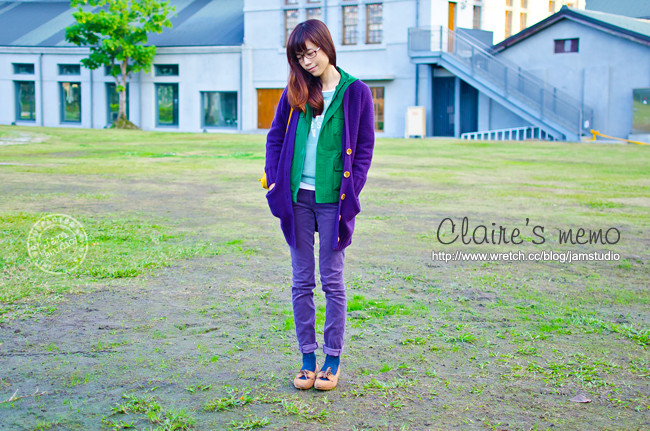 上下身得紫色飽和度與深淺不同就不會像在穿套裝了!