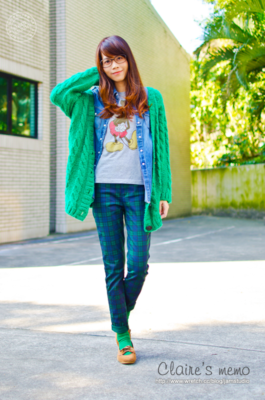 因為洋裝較薄所以選了綠X灰的後棉T恤搭配增加一些保暖度。